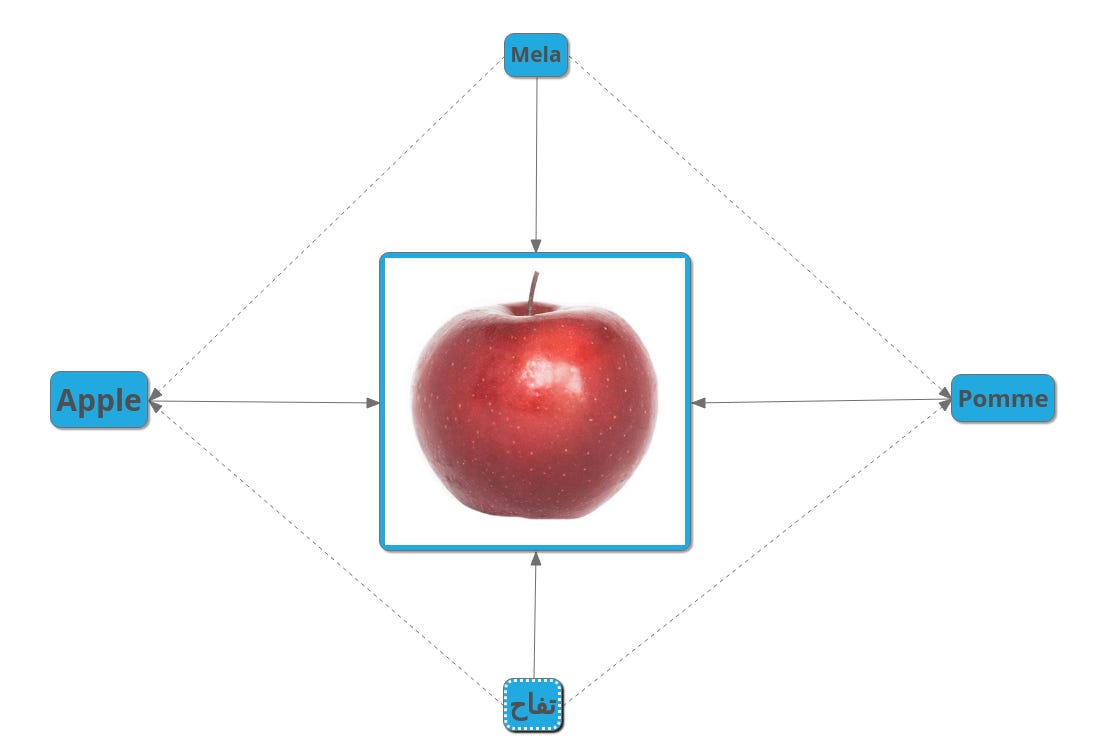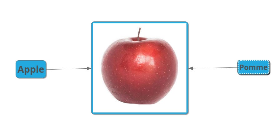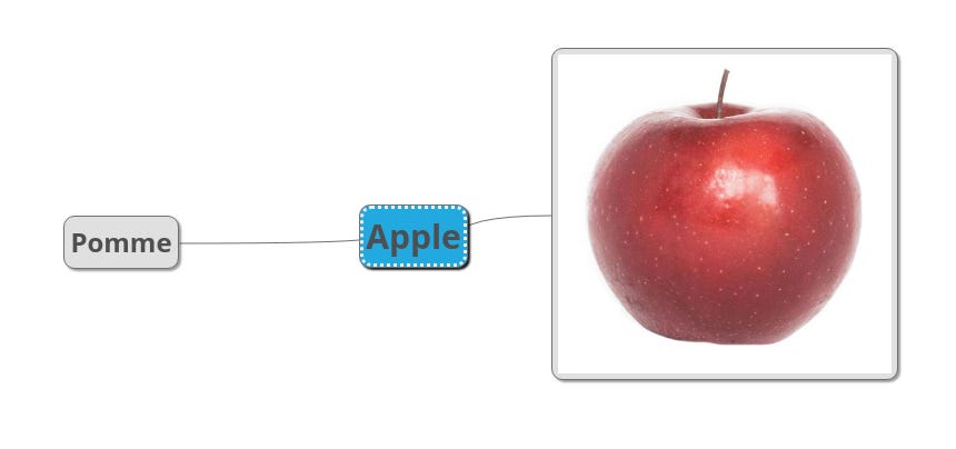 This is pretty abstract, so I’ll use a simple but concrete example to show how the process works and why memorizing translations is bad. You want to describe a fist-sized red fruit that grows on a tree - your brain travels down the appropriate path of neurons and finds that fruit, then seeks out where the word ‘apple’ is stored, then retrieves it to be expressed as needed. This is the simplest & fastest pathway available - a single-step search between object and word, the ideal scenario. When you learn translations, you are adding another step to this operation: your brain must identify the object, then go find the word apple, then go find the corresponding word in your target language, then return it & express it.